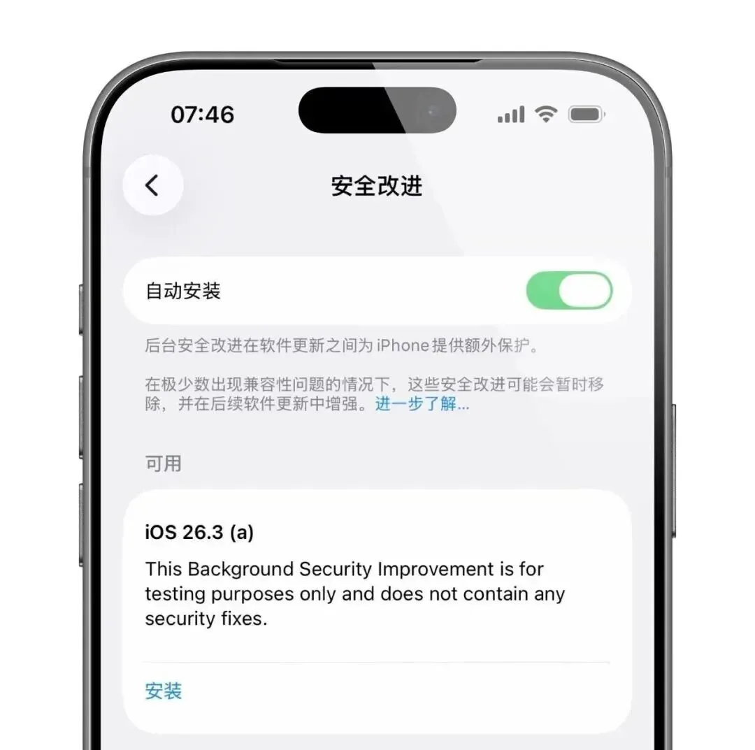 iOS 26.3 Beta1的用户,点击设置→隐私与安全性→后台安全改进,稍等数秒就可以看到iOS 26.3(a)。