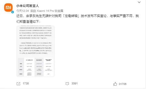 持续发酵后,小米下场回复,官方发言称:余承东先生无端针对我司龙骨转轴技术发布不实言论,与事实严重不符。