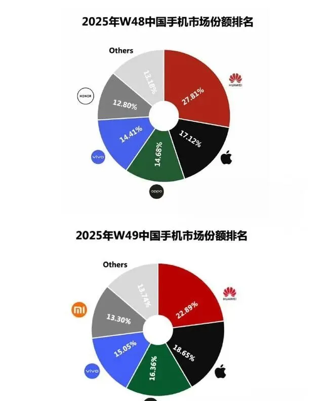 市场认可度直接体现在销量和份额。Mate 80系列上市当天线上线下全线告捷,销量比前代暴涨近90%,标准版涨幅140%。11月底到12月初,华为市场份额连续两周全国第一,最高27.81%,把苹果远远甩在身后。不是靠营销噱头,不是堆硬件,更不是跟风参数,而是靠软硬芯云一体化的极致体验。