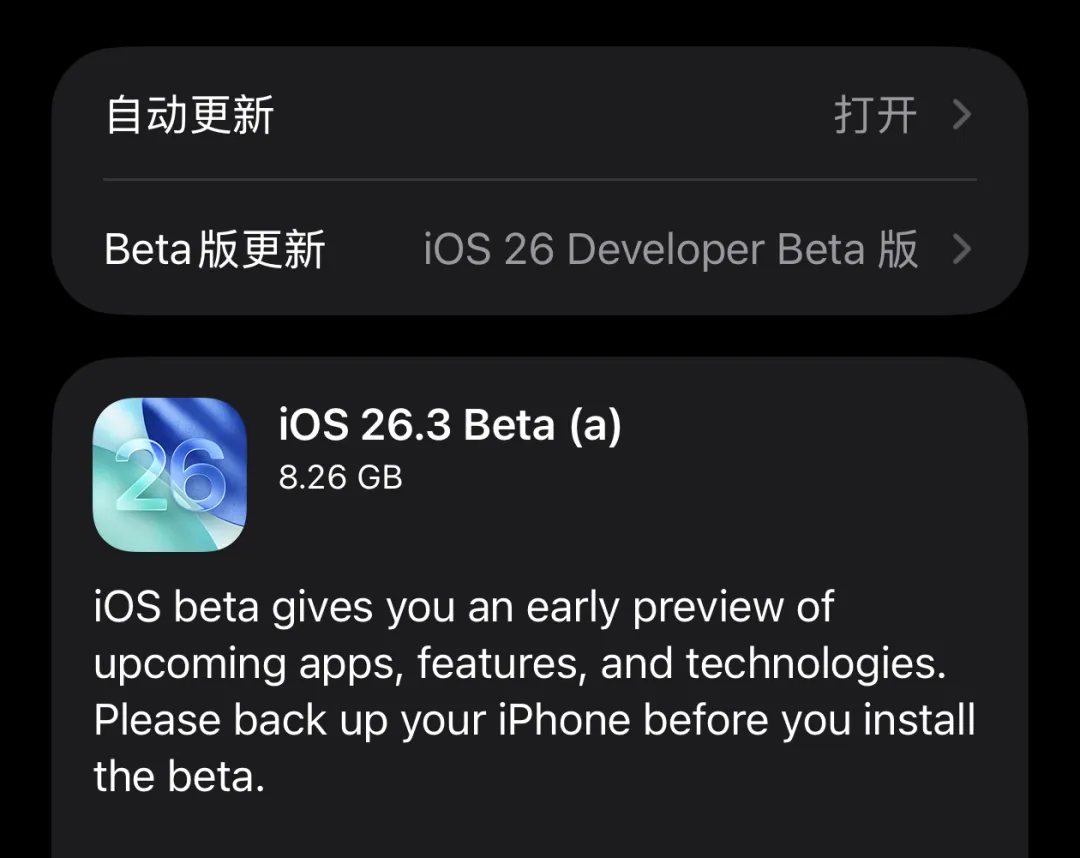 今天苹果推送了 iOS 26.3 Beta (a)更新,这个版本其实就是一个安全补丁,没有任何新功能。