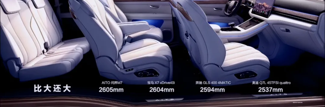 AITO 表示,问界 M7 前、中、后排的纵向空间之和达到了 2605mm,空间转化率达到了 92.4%。