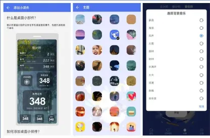 正计时、倒计时和番茄钟功能支持多个唯美背景音乐,包括:静音、海浪、风声、大雨、森林、时钟、水滴声、大火、河流、夜晚、音乐盒。