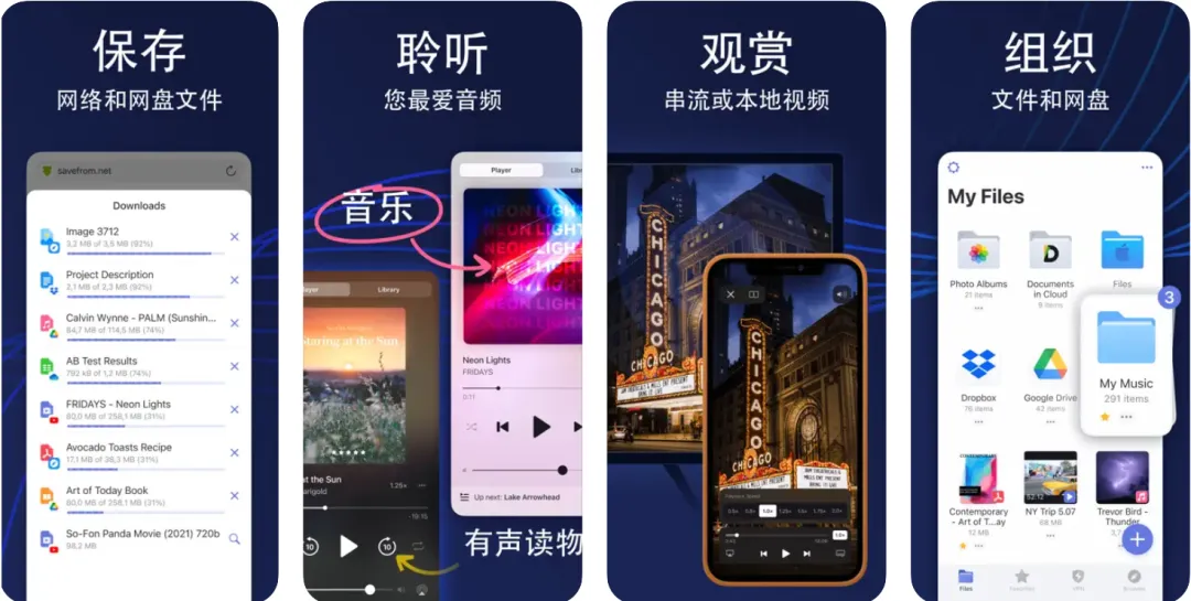 支持播放多种常见的音视频文件,还能在线阅读和编辑PDF文件,甚至解压、压缩文件也能在手机上实现!