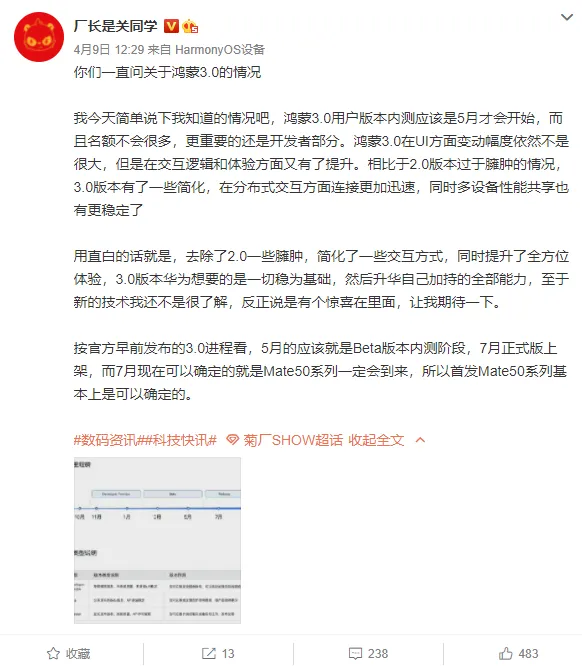 日前,据数码博主@厂长是关同学 透露,根据其了解到的情况,鸿蒙3.0用户版本内测应该是5月才会开始,不过名额不会很多,更重要的还是开发者部分。