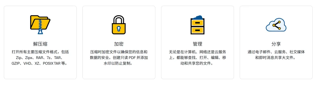 - 核心能力:AES-256加密、分卷压缩、文件修复(独家专利)、自解压包制作,定位传输大型/受损压缩包。