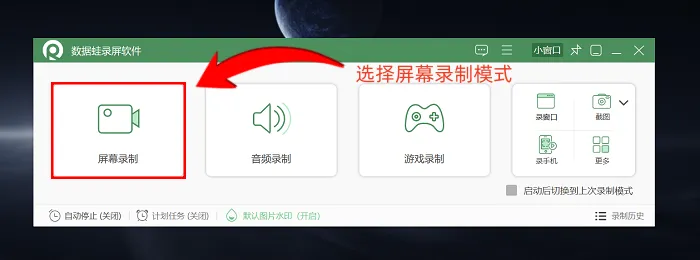 启动软件,它会自动弹出多种录制模式,没有特殊需求的话,点击【屏幕录制】就可以了;