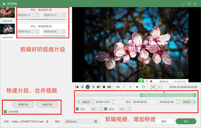 录制结束后,若有对视频进行后期处理的需求,可点击【高级剪辑】按钮,在该页面中,大家可以给视频分段剪辑或者添加效果,无需额外导入其他剪辑软件。