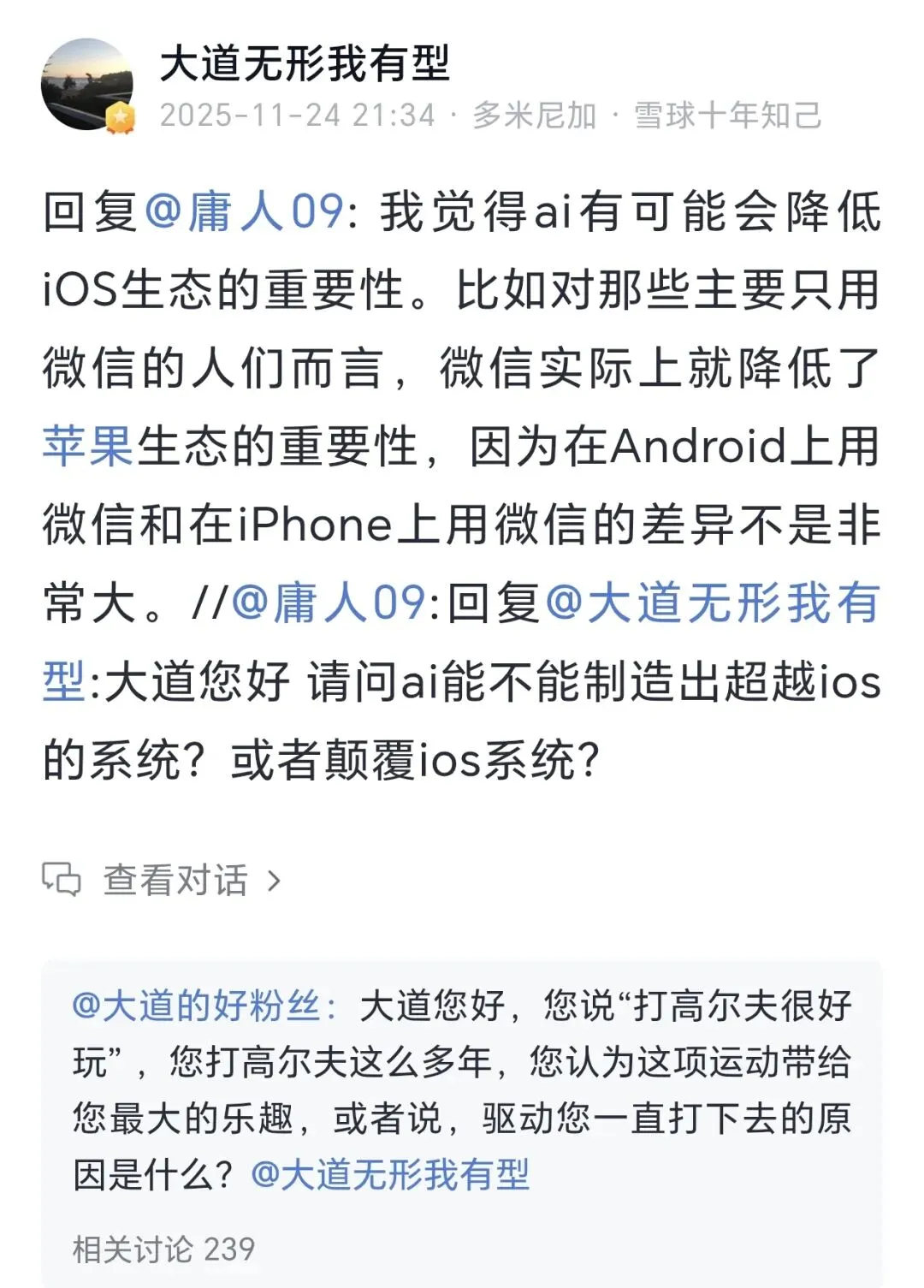 段永平:我觉得ai有可能会降低iOS生态的重要性。因为微信就降低了iOS的重要性。