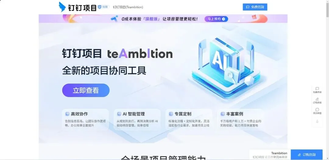 Teambition以“任务可视化+文档协作”为核心,支持任务分解、依赖设置、里程碑管理,同时内置即时通讯功能,减少跨工具切换成本。其突出优势在于外部协作便捷,可直接邀请客户、合作伙伴加入项目,且与钉钉深度集成,消息实时同步,非常符合国内企业的协作习惯。操作界面简洁友好,新手易上手,免费版支持小团队使用,付费版按人数计费。适用场景覆盖互联网产品研发、设计、运营团队,以及需要外部协作的中小企业跨部门项目。