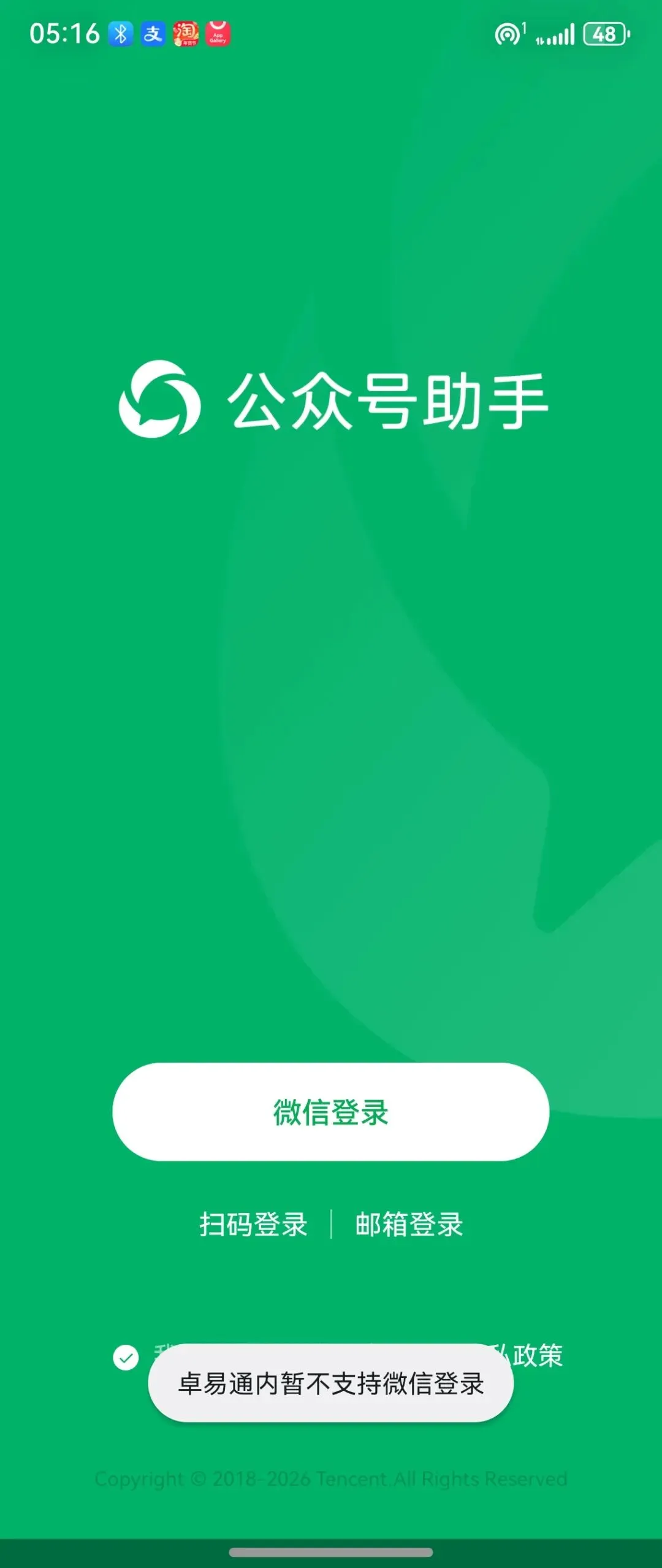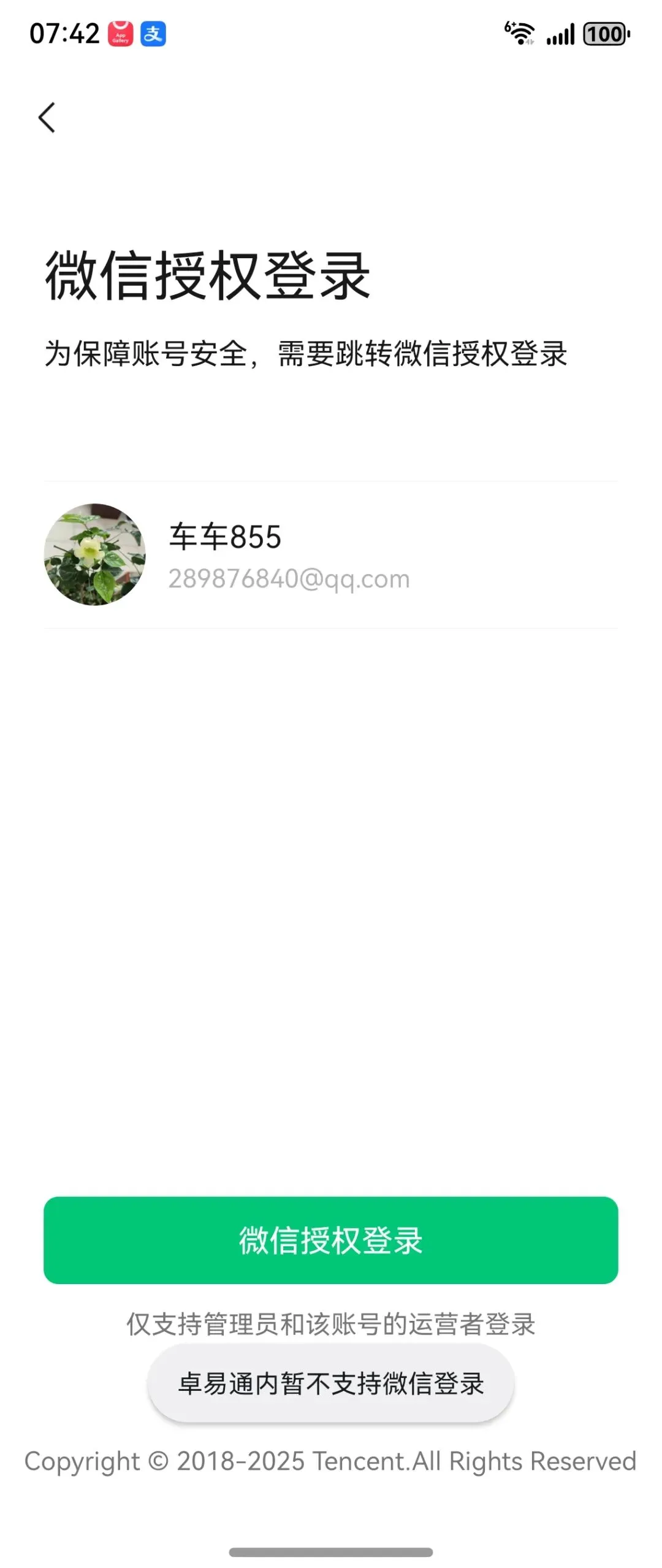 没办法,只能乖乖重装卓易通和公众号助手,换邮箱登录。可点击登录后,系统又自动跳回微信授权登录,接着再次弹出“卓易通内暂不支持微信登录”的提示!
