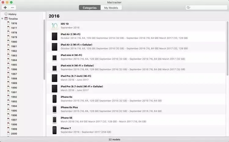 我们的日常工作中经常需要引用一些苹果的产品的信息,Mactracker 将这些基础信息汇总到一处,节省了单独查找的时间,而且不会受到网速的影响。值得一提的是,除了通过检索、分类来查找产品,Mactracker 还提供了苹果产品发布的时间流,方便从宏观上了解不同产品的发售情况。