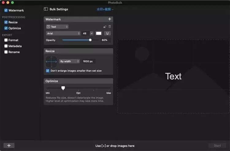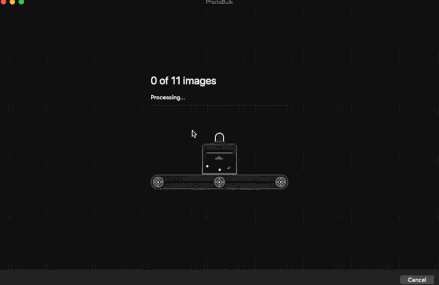 PhotoBulk 提供了水印、裁剪、压缩和重命名等操作,使用前可以勾选需要的部分并进行设置,接下来只需要把图片拖入进来就能完成编辑了,不论是单独的图片还是文件夹,拖进来就能搞定了。P.S.PhotoBulk 运行时的动画非常棒!