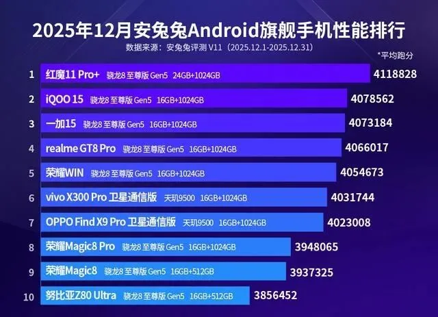 安卓旗舰性能榜又炸了,12月这波数据一刷出来,第一反应就是——天花板又被抬高了。12月安卓旗舰性能榜刚刚揭晓,这次不仅有新芯片助阵,榜单格局也被彻底洗牌。红魔11 Pro+再度斩获冠军,跑分高得离谱,榜单前十竞争激烈,但红魔11 Pro+一骑绝尘,平均分数直接拉开了断层。有人质疑今年性能榜是不是又成了红魔的主场?不是只有硬件堆料,也不是只有散热风扇,更没有单纯靠跑分刷存在感,这次榜单背后的变化,远不止一串数字。