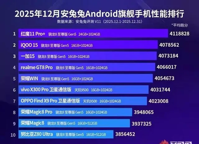 榜单出炉时间定在12月,榜单主角依然是红魔11 Pro+,这台24GB+1TB版本的平均分高达411.8万,比11月又高了1.3万分。榜单前十的分差拉到26万+,新机发布潮让12月榜单变得更热闹。最意外的是一加15,直接从第八飙升到第三,平均跑分407.3万+。荣耀WIN和努比亚Z80 Ultra作为新面孔杀入榜单,整体来看,安兔兔榜单的权威性和参考价值再次拉满。