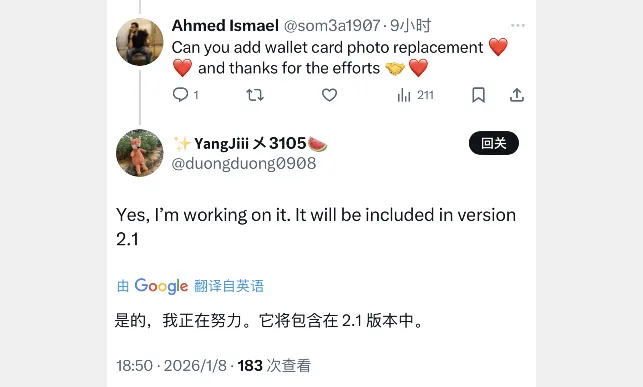 还透露一个新功能,在 2.1 版本中,确定有卡包封面修改功能,之前没有添加此功能,因存在一些问题,现在即将完成。