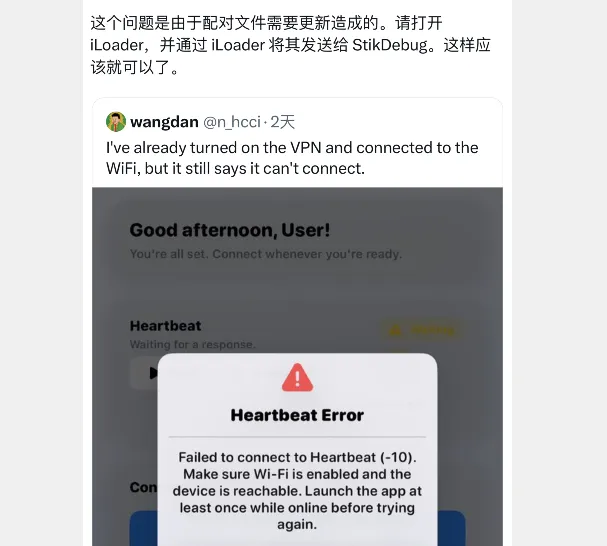关于提示 Heartbeat Error 报错的问题,这是由于配对文件需要更新造成的,请打开 iLoader,并通过 iLoader 将其发送给 StikDebug,这样就能解决了。