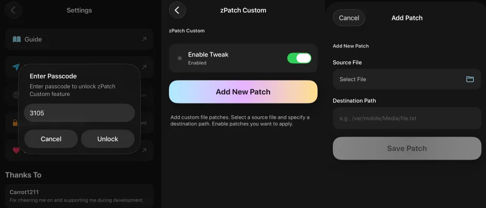 右上角设置,点击 Enale zPatch Custom 选项,输入 3105,即可开启自定义修改功能,此功能并不稳定,测试需谨慎。