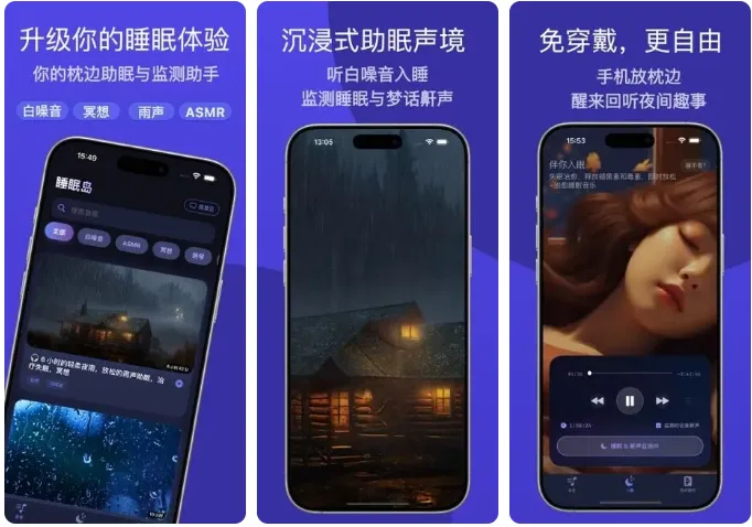 写在开头:一款将海量助眠音频、入睡即停、免穿戴睡眠监测、鼾声/梦话记录整合在一起的睡眠应用。无需佩戴手表,你按平常入睡即可,App在后台自动识别入睡、深度睡眠与小憩,生成睡眠记录与趋势分析。同时捕捉鼾声与梦话并可回放,特别适合经常熬夜或失眠的小伙伴!--目前下载限时免费!白噪音、自然声、ASMR、助眠音乐任你选择;配合智能定时,声音在入睡后自动渐弱停止,支持循环、离线与后台播放。