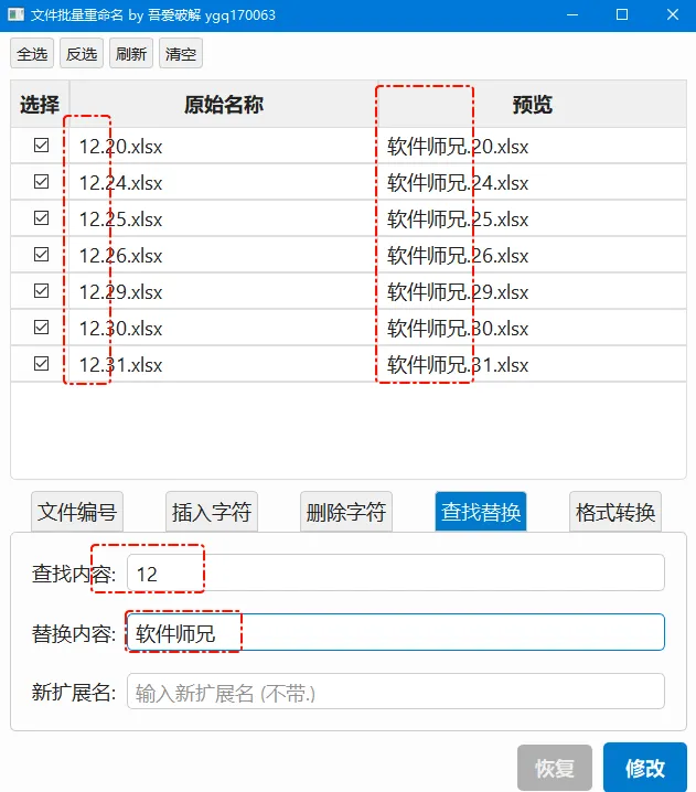 你也可以使用查找替换功能,比如我现在想把文件名称前面的“12”统一改成“软件师兄”,输入好内容之后直接点击右下角的修改即可。
