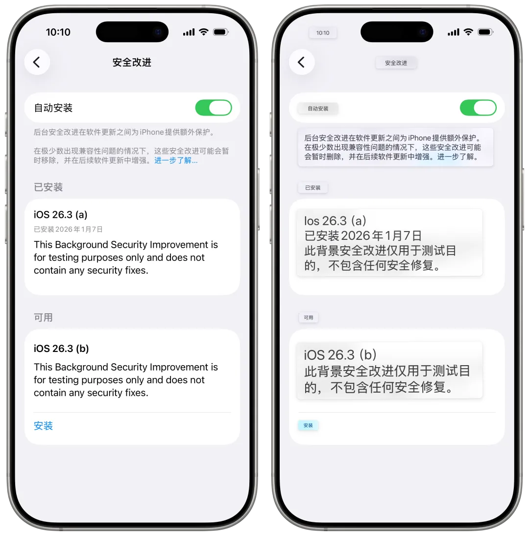 在前几天苹果发布了 iOS 26.3(a) 安全改进更新之后,就在今天凌晨苹果又又又发布了 iOS 26.3(b) 安全改进更新,完全没有逻辑和规律。如果是 iOS 26.3 测试版系统用户,直接进入设置 - 隐私与安全 - 安全改进里面即可直接安装此更新。更加神奇的是,上次苹果在开发者文档中表示 iOS 26.3(a) 就单纯是测试安全改进功能的一次空更新,甚至连例行的安全修复都没有。而本次,苹果在 iOS 26.3(b) 中依然表示:此安全改进仅用于测试目的,不包含任何安全修复。啊哈!苹果到底在玩什么呢?