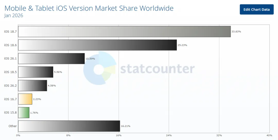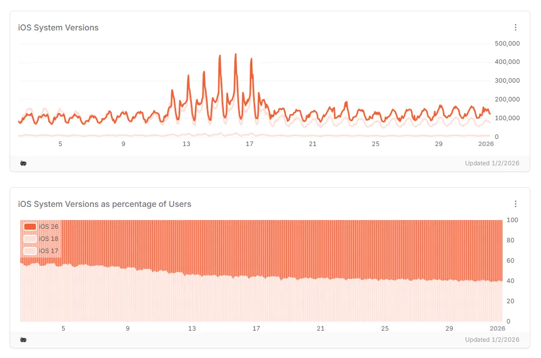 不过另一家数据调研机构TelemetryDeck分享的数据却显示,大约60%的用户已经更新到了iOS 26系统,而仍有约37%的用户停留在iOS 18。