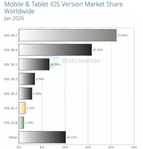 如果要评选一件2026刚开始,手机圈最应景的事情,个人认为和苹果有关,那就是iOS26刚好对应新年,按理来说果粉应该很有兴趣升级才对,但事实情况又好像严重不符,近日有知名调查机构发布了相关数据显示,自去年推出首个正式版至今,iOS26升级率严重不符合官方预期。
