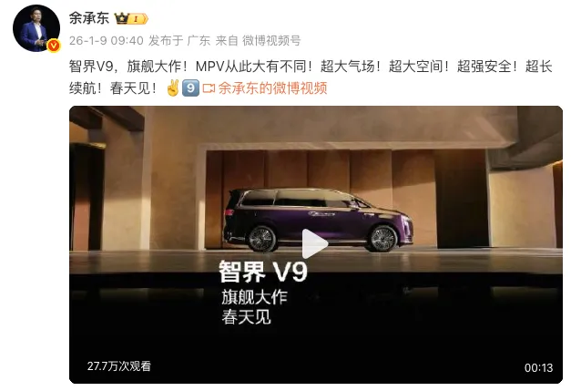 今天,华为常务董事余承东宣布:鸿蒙智行首款MPV智界V9即将在今年春季正式发布。官方将其定义为“旗舰大作”,并且拥有“超大气场、超大空间、超强安全、超长续航”,表现应该会很亮眼。