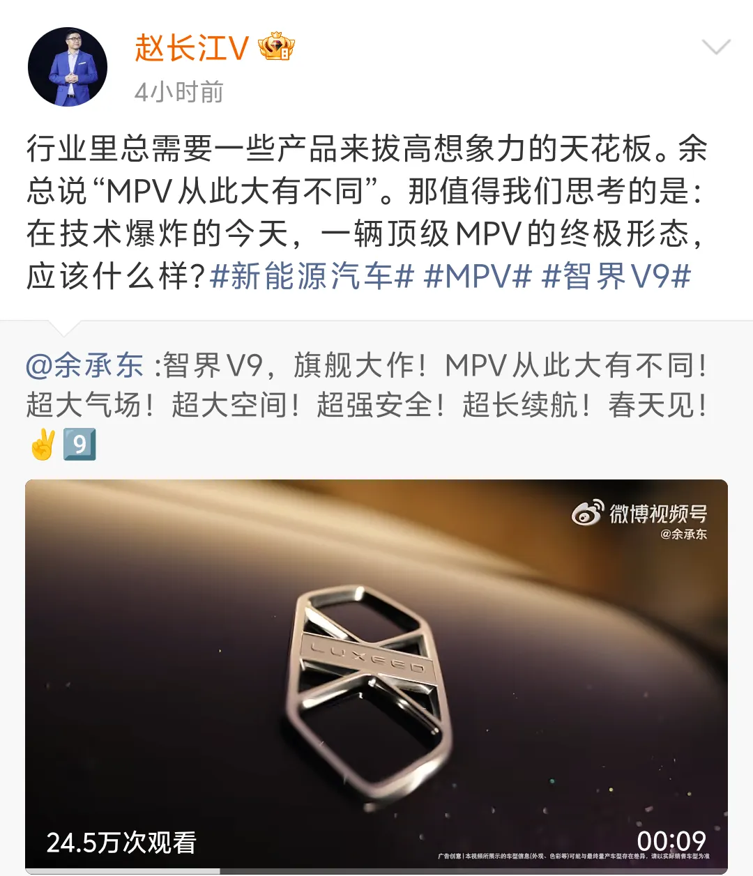 在这两个月内,有关赵长江的下一份工作,众说纷纭,有人说他会加入问界,有人说已经确认加入智界......对此,赵长江曾在11月发文澄清,表示自己还在休息中,有变化第一时间跟大家汇报。而就在今早10点,赵长江突然发布了一则智界V9的宣传微博。三个月不到,看来,赵总已经找好下家了。