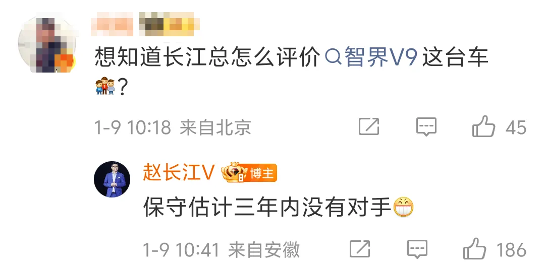 评论区有人问赵长江,“你怎么评价智界V9这台车?”赵长江自信地回应道,“保守估计三年内没有对手。”