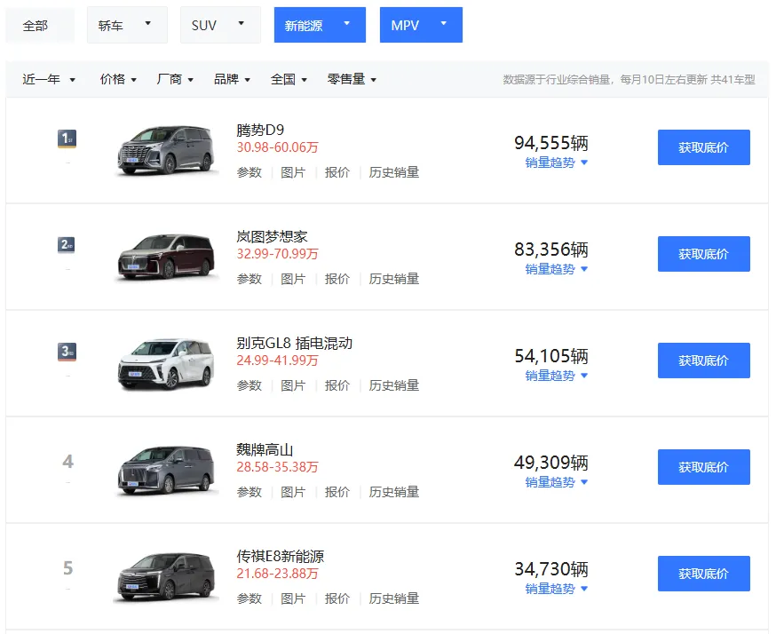 从近一年,新能源MVP的销量情况来看,腾势D9依旧霸榜,年销量在9万左右,岚图梦想家也是榜单前三名的常客,销量在8万左右。两款车型定价均在30万-70万这个区间,反映出该价格段竞争十分激烈。图源:易车