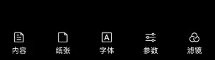 软件底部设有功能栏,涵盖内容编辑、纸张切换、字体选择、参数调整、滤镜添加五大核心选项,满足多样化的创作需求。