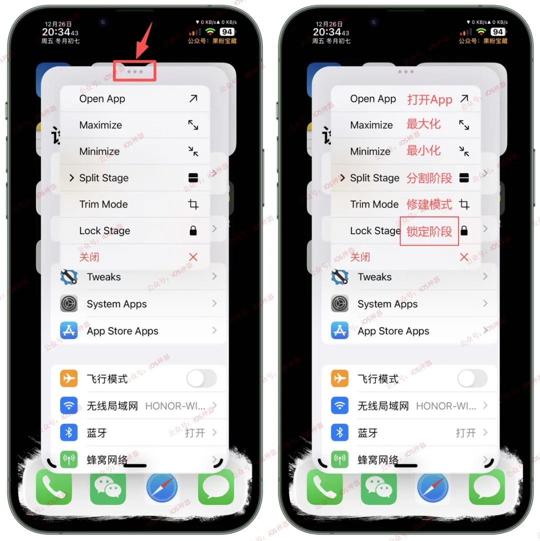 点击【获取】-【重启 SpringBoard】即可。长按【应用图标】-【Open in Aerial】即可开启分屏,拖动底部可自由调整窗口大小。点击顶部【···】呼出功能菜单:打开APP、最大化、最小化、分割、修剪、锁定、关闭。点击【Minimize】最小化,缩小成小图标后,【滑动图标】可以随意移动,【点击】可打开悬浮,【长按】可打开APP,也可直接关闭。点击【Split Stage】分屏模式:上半部分、下半部分、上三分之一、中三分之一、下三分之一,可根据需求自由选择。2、还是非常实用的插件,不喜勿喷!