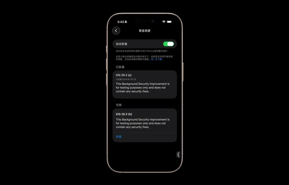 苹果官方已经明确:iOS 26.3 (a) / (b) 属于全新的 Background Security Improvements(后台安全改进)体系。它不是系统更新,也不是补丁合集,而是一次 分发能力 + 稳定性 + 撤回机制 的全链路压力测试。