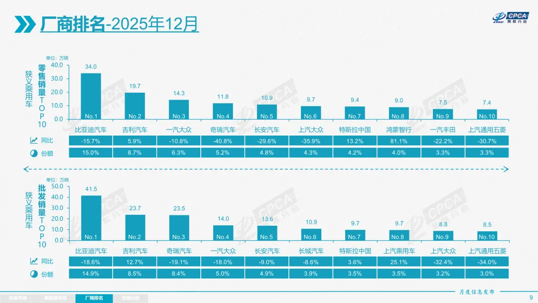 依据乘联分会公布的国内车企零售销量榜单来看,12月零售销量排名前十的厂商分别为比亚迪汽车、吉利汽车、一汽大众、奇瑞汽车、长安汽车、上汽大众、特斯拉中国、鸿蒙智行、一汽丰田、上汽通用五菱。其中,鸿蒙智行同比涨幅最高,同比增长81.1%。