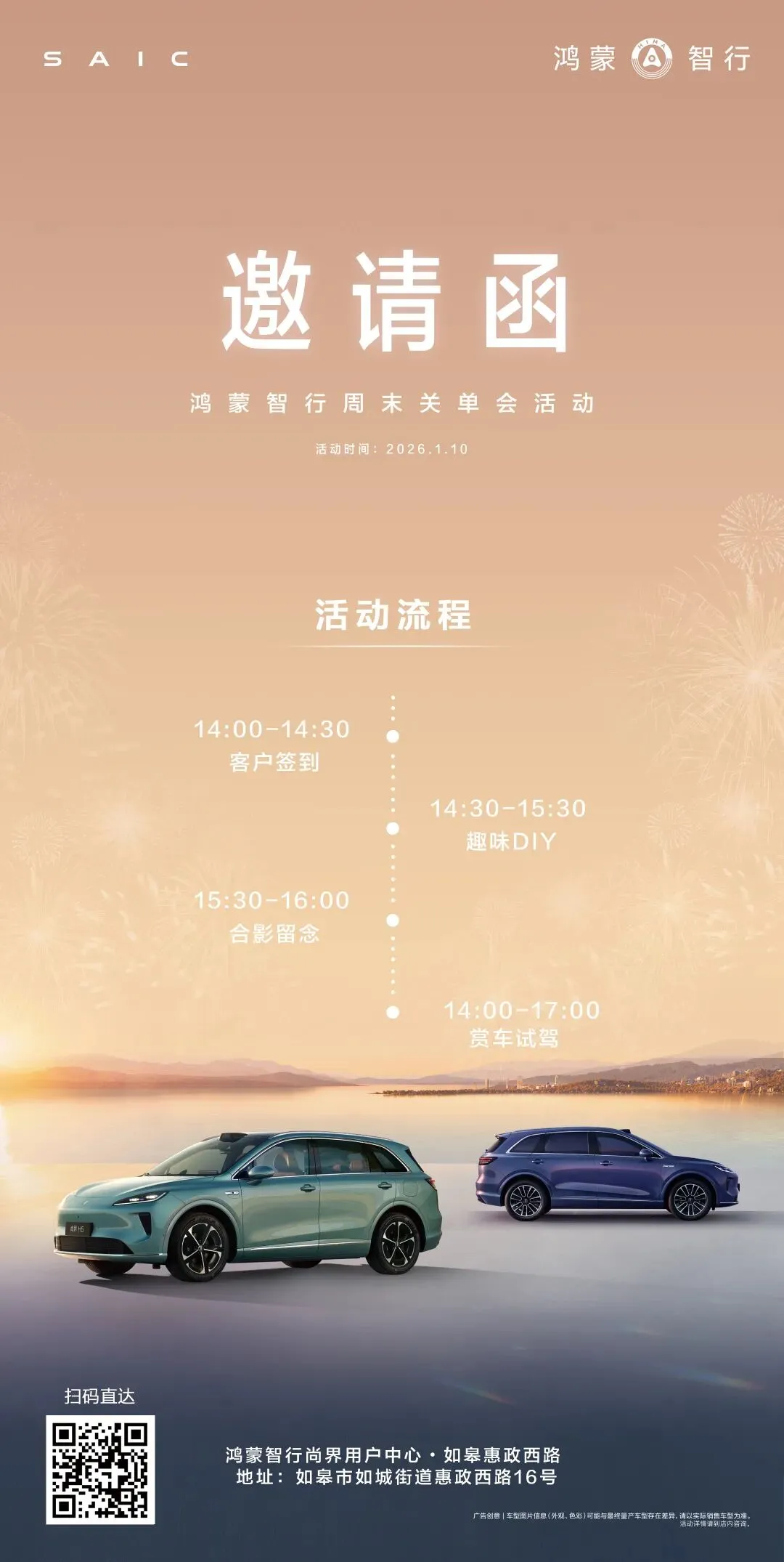 草木摇金,岁末添新,鸿蒙智行尚界用户中心邀您共赴一场融合科技与年味的周末之约!1月10日,鸿蒙智行周末关单会将在如皋惠政西路暖心开启,不仅能沉浸式体验尚界H5的智慧驾乘,更有新年毛毡画DIY手作乐趣,搭配专属购车优惠,让您在温馨氛围里解锁新年出行新选择。
