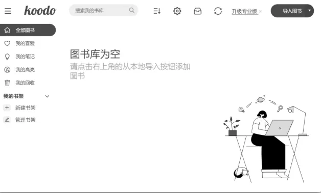 首次打开软件界面是空的,需要我们手动导入电子书。点击右上角的【导入图书】,选择本地小说或电子书文件即可。