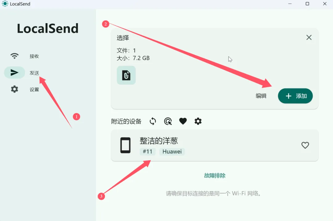 这里就以windows和安卓之间文件互传为例,首先需要各个设备在同一个局域网下,如果要把windows端的文件传输给安卓端。只需要在windows端的软件中点击传送,然后选择好需要传输的文件,点击需要传输的设备。