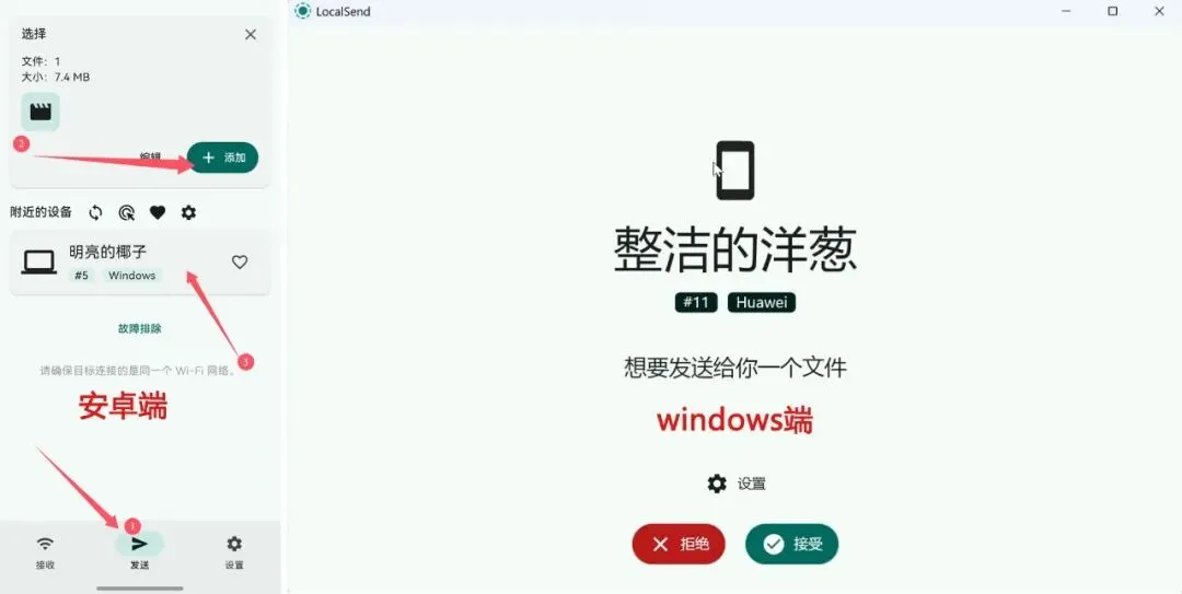 如果是需要把安卓端的文件传输给windows端,那么操作方式正好相反。在安卓端的软件中点击传送,选择好需要传输的文件,点击需要传输的设备,这时windows端就会收到接收指令,点击接受即可。