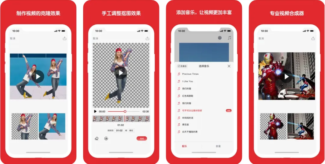 它支持强大的视频剪辑功能,包括:视频画幅和比例、视频背景、音乐素材、滤镜、开场特效、文字贴图、删除、排序、替换、复制、时长截取、分割、变速、调整画面、画面调节。