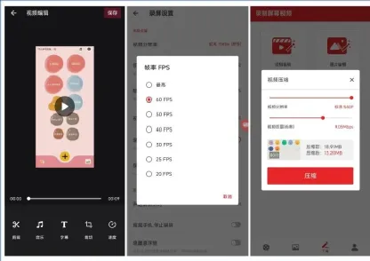 它支持丰富的录屏设置选项,包括:视频分辨率、视频质量、视频帧率、视频方向、录制音频、保存路径、录屏开始前倒计时、摇晃手机停止录屏、悬浮窗录制、灭屏停止录屏、截屏、摄像头、屏幕画笔。