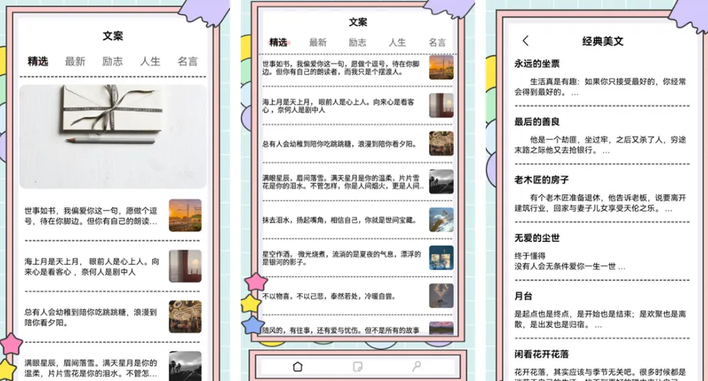 此外,用户可以在软件上搜索各种类型的文章,例如伤感的美文、唯美的美文、爱情的美文等。