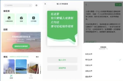 它支持文字视频功能,只需要输入文字或者录音,就可以轻松制作视频,支持多种音色,支持多个精美模板。