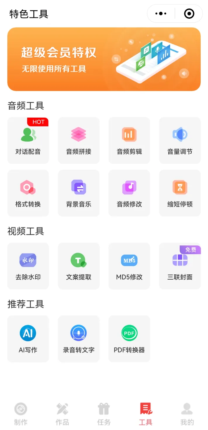 软件还支持音频拼接、音频剪辑、去除水印、文案提取等功能。