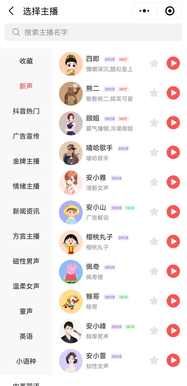 里面有上百位AI智能主播声音可以选择,播音腔、大叔、萝莉、御姐、方言、还有上百位小语种主播。