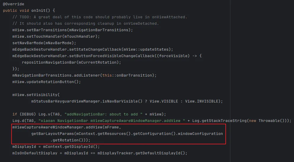然后走进createNavigationBar()方法中。然后走进NavigationBar.init()方法中。NavigationBar继承自ViewController,会走进ViewController.init()方法中。NavigationBar重写了onInit()方法,就会走到开头说的终点。