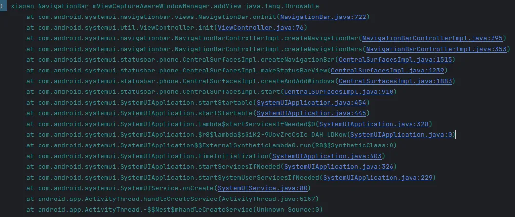 然后会进入SystemUIService的onCreate()方法中。SystemUIService除了onCreate()方法,其他方法意义不大,可见SystemUIService是一个容器。这里先贴一个堆栈。