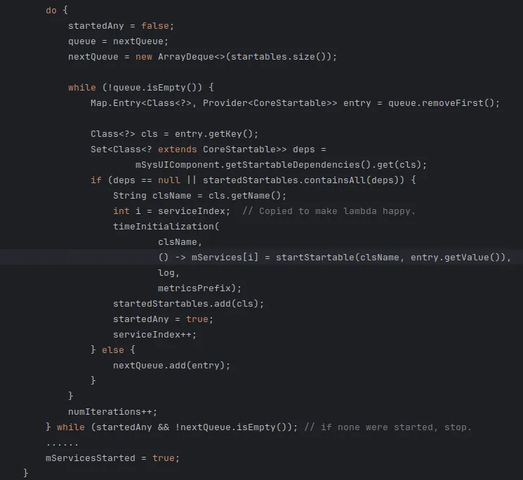 startBootstrapServices(t);startCoreServices(t);startOtherServices(t);startApexServices(t);