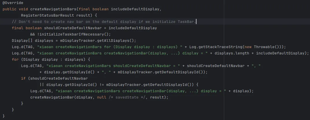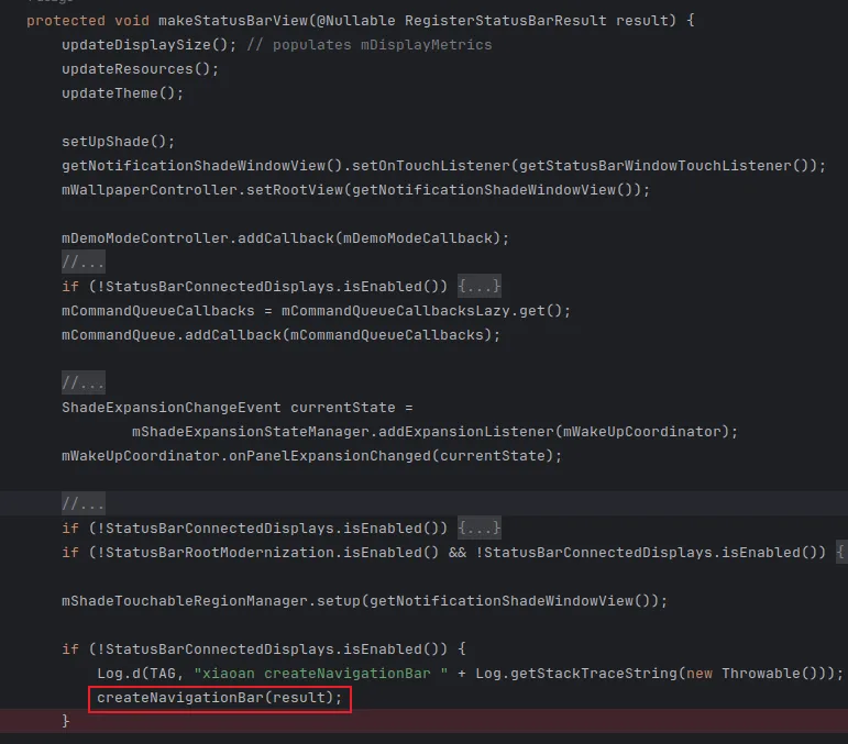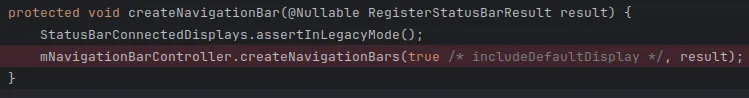 然后走进makeStatusBarView()方法中。然后走进createNavigationBar()方法中。然后使用NavigationBarController.createNavigationBars()方法去创建导航栏。NavigationBarController是个接口,有两个实现类,NavigationBarControllerImpl是手机上使用的。