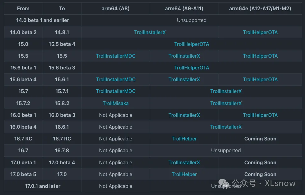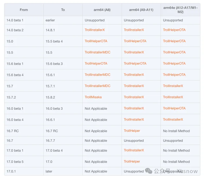支持的设备arm64 (A8 - A11)目前只适配到iOS17.0,后续应该都可以arm64e (A12 - A17 / M1 - M2)支持 iOS14 – iOS16.6.1 & iOS17