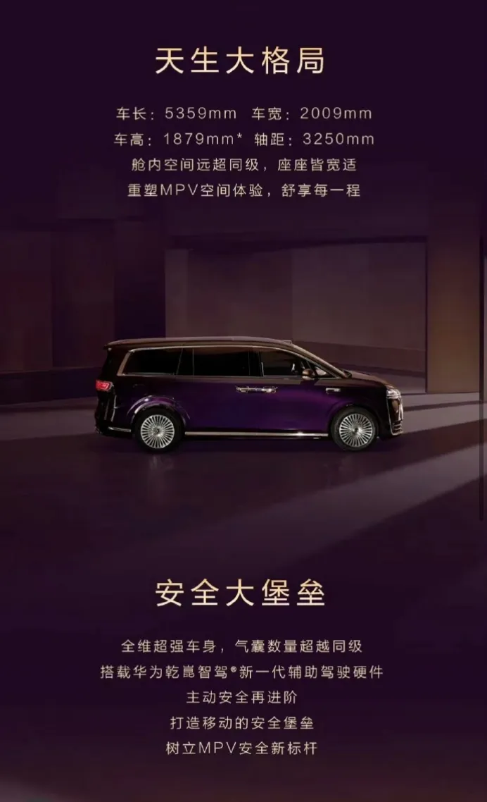 安全方面,官方虽未公布细节,但宣传口径极为硬核,MPV最强车身架构、最多气囊、最高安全标准,这显然要对标腾势D9、极氪009等高端选手。